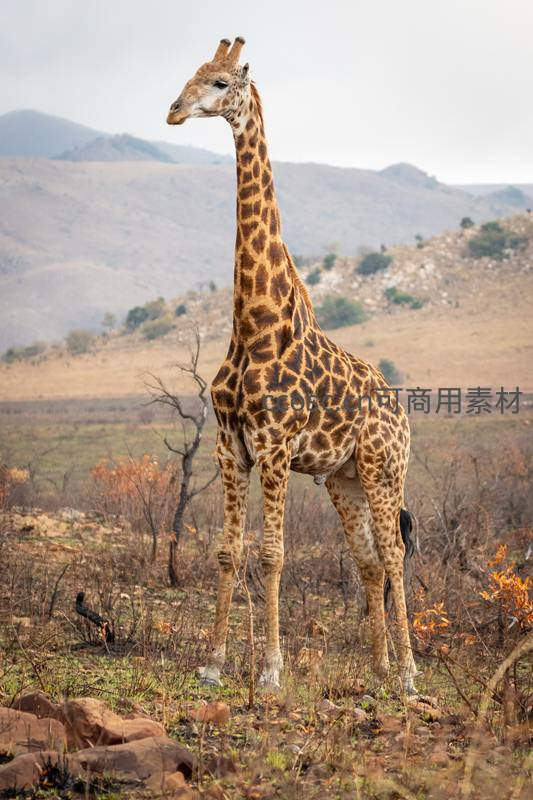 长颈鹿独立荒野远眺苍茫山脉