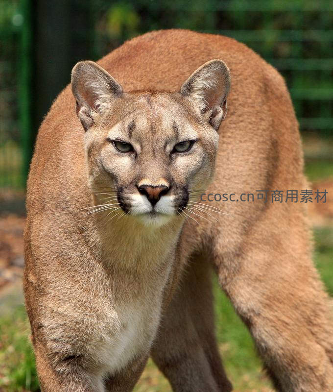 一只美洲狮正面向镜头,目光如炬,肌肉紧绷,展现出顶级掠食者的冷静与力量,背景绿意模糊更显主体气势。