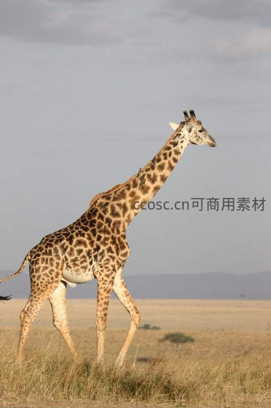 一只高大的长颈鹿独自漫步在广袤无垠的草原上,它修长的身影在灰蓝色的天空下显得格外孤寂而优雅。稀疏的草丛和远处的地平线,共同营造出一种宁静而苍茫的氛围。