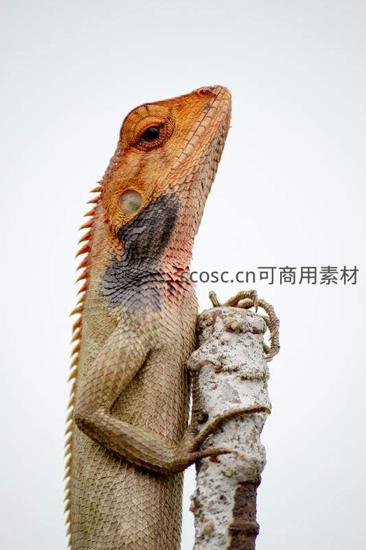 一只橙褐色的蜥蜴紧紧攀附在粗糙的树干上,头部高高扬起,目光投向远方,背部鳞片与刺状脊清晰可见,背景纯净如画。