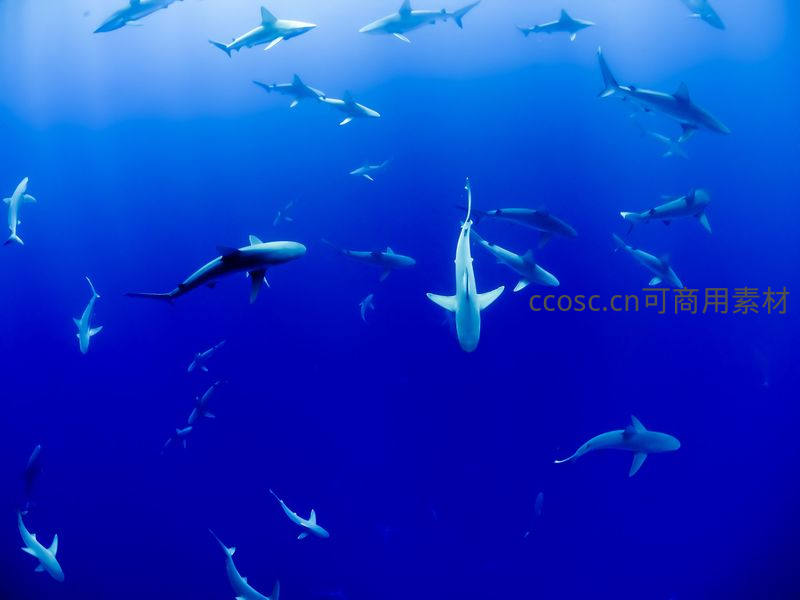 在幽深湛蓝的海洋深处,一群鲨鱼在光束中缓缓游动,它们矫健的身姿与神秘的环境共同营造出一种原始而宁静的壮丽景象。