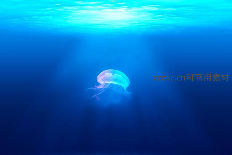 一束束阳光从海面倾泻而下,照亮了深海中一只半透明的水母,它如精灵般轻盈漂浮,散发着柔和光芒,营造出空灵唯美的氛围。