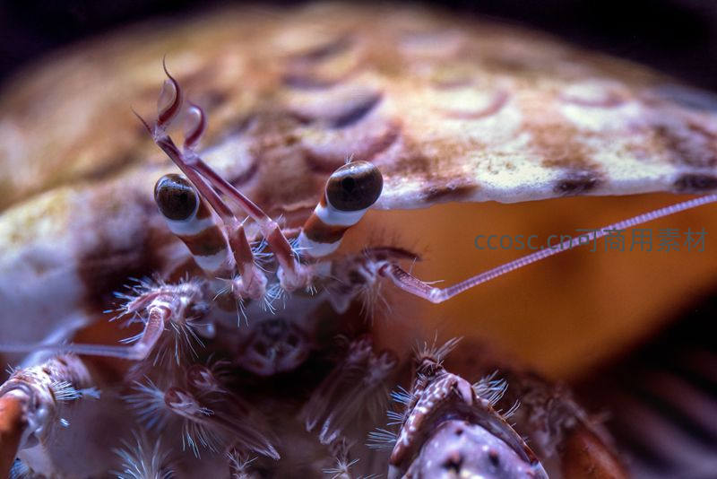 镜头拉近至寄居蟹面部,清晰呈现其圆润复眼、纤细触须及甲壳上的精致纹理,揭示了微小海洋生物令人惊叹的复杂结构。
