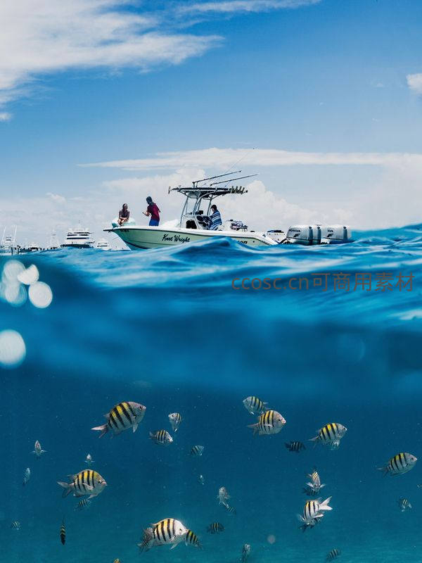 半水下视角展现碧海蓝天下的白色游艇,船旁游客悠然自得,水下一群条纹鱼自由游弋,呈现人与自然和谐共生的画面。