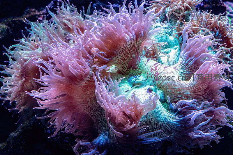 在幽暗的海底环境中,一簇色彩斑斓的海葵如花朵般绽放,粉红与蓝绿交织的触手在水流中轻柔摇曳,宛如梦幻的海底花园。
