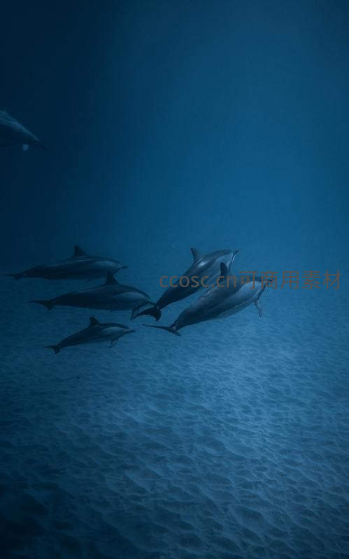 一群海豚在幽暗深蓝的海底缓缓游弋,阳光穿透水面洒下斑驳光影,沙质海底映衬着它们流畅的身姿,尽显海洋王者的优雅。