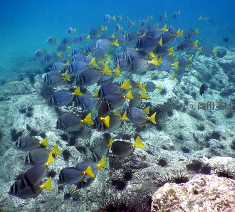 一大群黄尾鱼在布满黑色海胆的浅海珊瑚礁上整齐巡游,灰蓝的身体与鲜亮的黄色尾鳍形成鲜明对比,在阳光照耀下熠熠生辉。