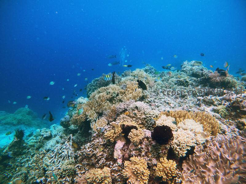 蔚蓝海水下,形态各异、色彩丰富的珊瑚礁构成繁茂的海底花园,各色小鱼在其间穿梭觅食,共同编织出一幅充满生命力的海洋生态画卷。
