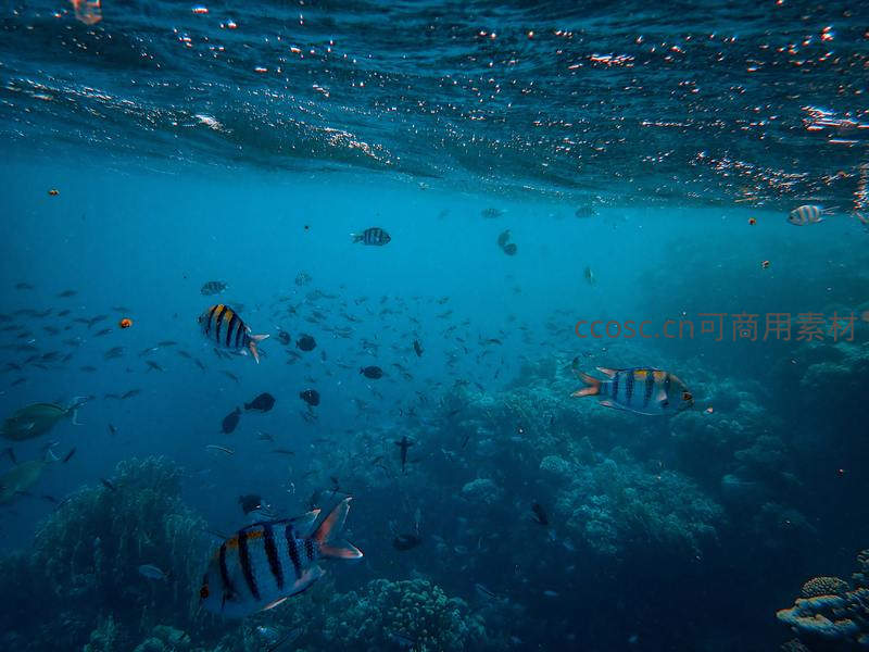 蔚蓝海水里,条纹鱼与小鱼群自由游弋,水面波光闪烁,映衬着海底珊瑚的静谧,展现海洋生命的活力与和谐。