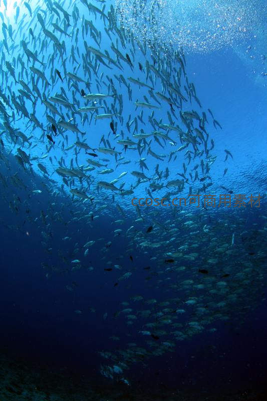 在阳光穿透的蔚蓝海底,一大群银色小鱼紧密聚集,形成壮观的漩涡状队形,水面气泡闪烁,展现海洋生态系统的活力与秩序。