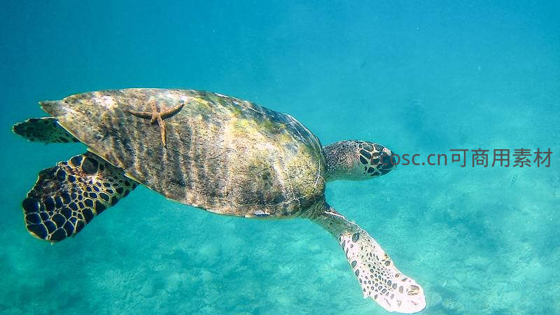 海龟背上栖息着一只小海星,悠游于碧蓝海水之中