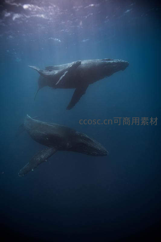 深海中两头座头鲸在阳光穿透的幽蓝水域优雅游弋