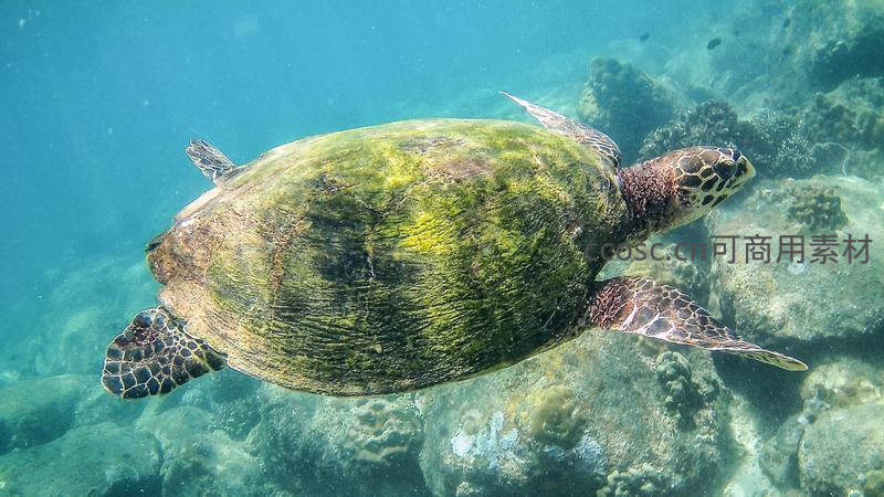 绿藻覆盖的海龟在珊瑚礁间穿行,展现海洋生态之美