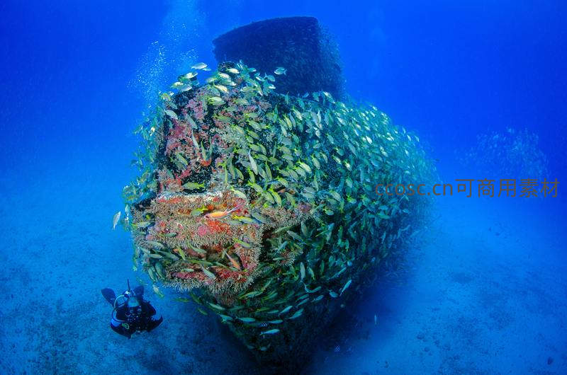 一艘沉没的船体被五彩珊瑚和密集鱼群覆盖,成为新的海洋栖息地,一名潜水员在旁静静观察,见证自然对人造物的重塑。