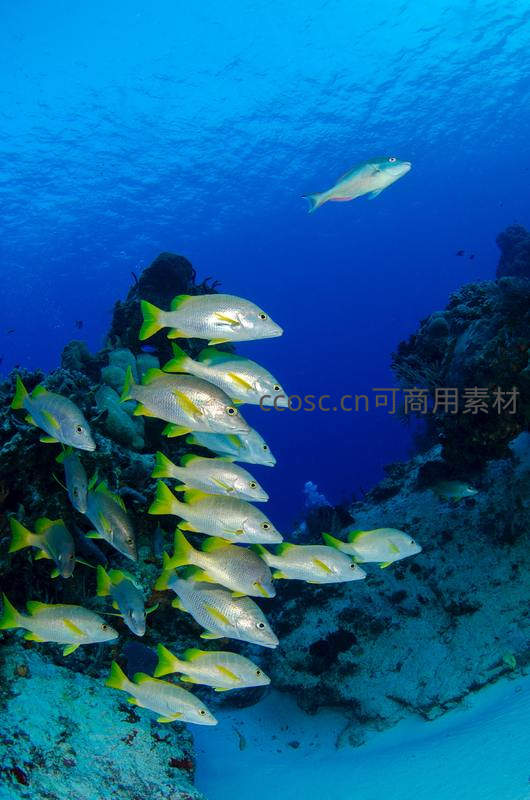 一群黄尾鱼在深蓝色海水中整齐游动,穿梭于崎岖的珊瑚礁之间,阳光穿透水面洒下斑驳光影,生机盎然。