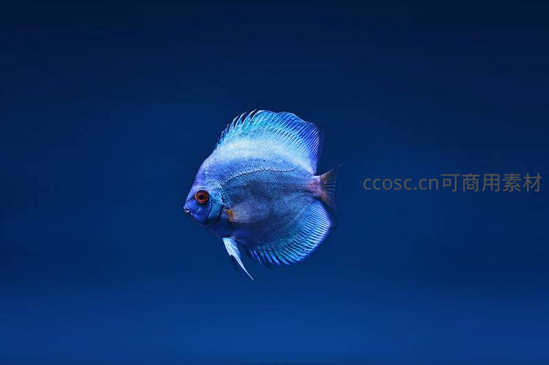 一只通体湛蓝的七彩神仙鱼在纯净的深蓝色水域中悠然游弋,其舒展的鱼鳍和明亮的眼眸展现出极致的优雅与宁静。