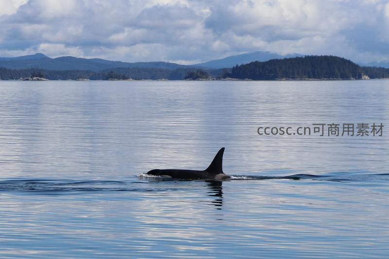 一只雄壮的虎鲸在平静的海面上游弋,高耸的背鳍刺破水面,远处是连绵的青山和多云的天空,展现出海洋生物的野性之美。