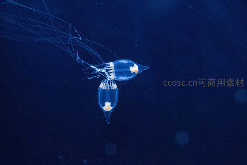 两只晶莹剔透的水母在深邃蓝海中相伴而行,细长触须轻柔飘动,如同一对优雅舞者,在寂静水域演绎生命之美。
