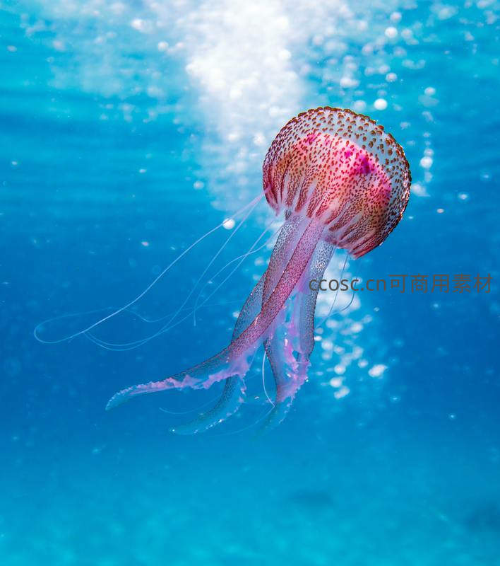 一只带有鲜艳粉红色斑点的水母在阳光穿透的浅蓝色海水中悠然漂浮,周围环绕着晶莹的上升气泡,呈现出梦幻般的视觉美感。
