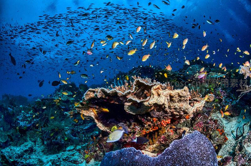 深蓝海域鱼群穿梭,珊瑚礁生机勃勃
