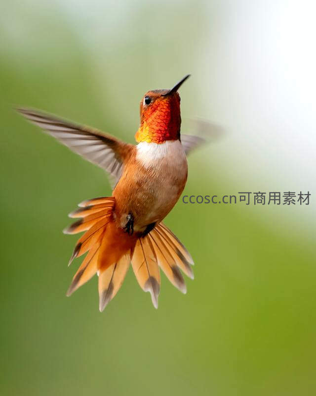 一只色彩鲜艳的橙红色蜂鸟在空中优雅悬停,翅膀因高速扇动而模糊成影,背景是柔和的绿色虚化,完美捕捉了其灵动姿态与自然之美。