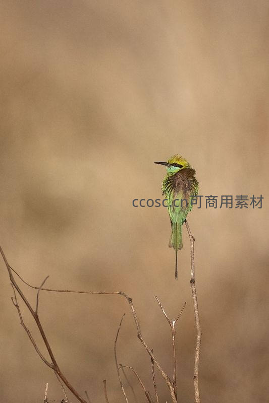 一只色彩鲜艳的绿蜂虎安静地停驻在一根纤细的枯枝顶端,其翠绿色的羽毛在柔和的暖棕色背景中格外突出,尽显大自然的生动与和谐。