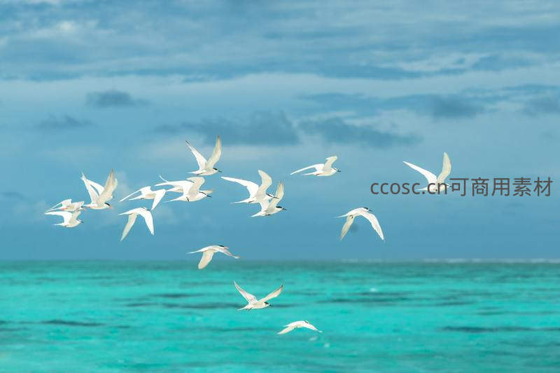 白鹭群飞碧海蓝天间