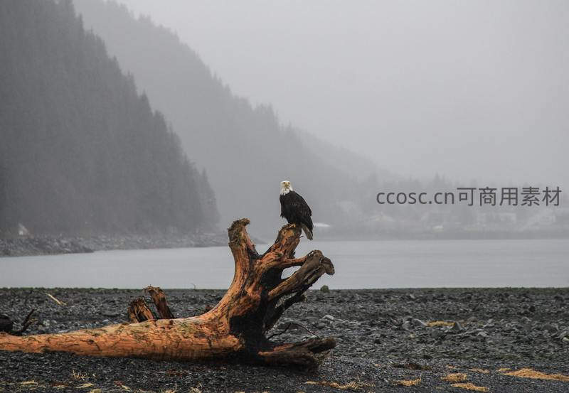一只白头海雕傲立于岸边的枯木之上,背景是云雾缭绕的森林山脉与平静湖面,展现出原始自然的壮美与孤寂。