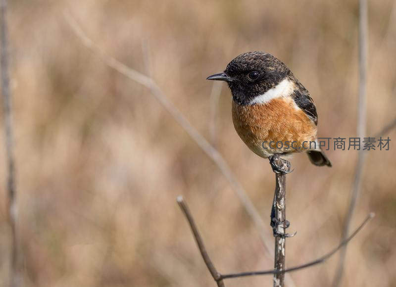 一只棕胸石鵖稳立细枝顶端,黑顶白颈与橙棕色胸羽鲜明对比,背景干草虚化突出主体,展现野外鸟类细腻生动的姿态。
