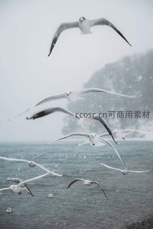 雪中海鸥振翅掠过,冬日海岸诗意飞扬