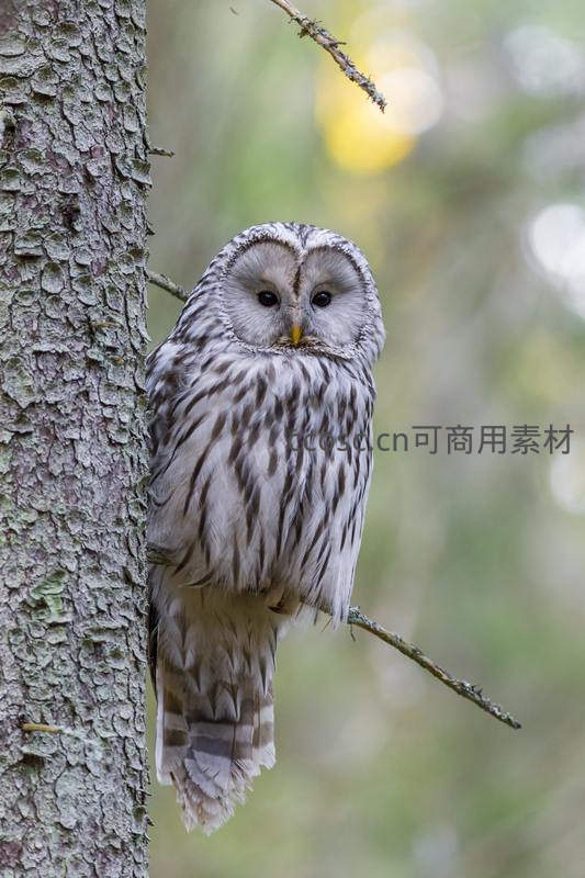 一只灰白条纹的猫头鹰安静地栖息在粗糙的树干旁,眼神专注而警觉,背景是柔和虚化的绿色林间光影。