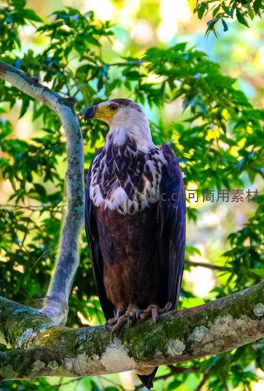 雄鹰栖枝绿叶间威严环顾