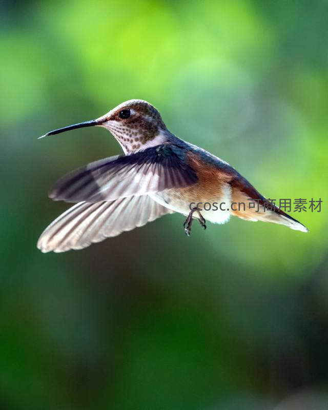一只小巧玲珑的蜂鸟在翠绿的背景中振翅悬停,其细长的喙和快速扇动的翅膀被完美捕捉,展现了自然界中令人惊叹的动态之美与生命力。