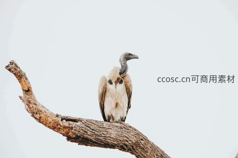 一只秃鹫站在粗壮的枯树枝上,背景空旷明亮,其光秃的头部和灰褐色的羽毛在自然光下显得格外真实,传递出荒野的苍凉感。