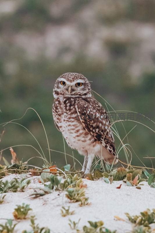 一只可爱的穴鸮站立在沙丘与稀疏草丛间,明亮的大眼睛充满警觉,斑驳的羽毛完美融入环境,展现其生存智慧。