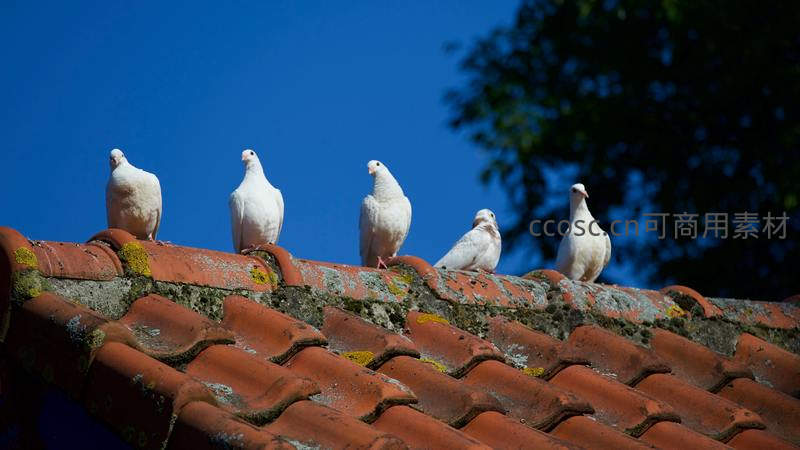 五只洁白的鸽子悠然伫立在布满青苔的红色瓦片屋顶上,湛蓝天空为背景,画面充满宁静祥和之感,象征着和平与生活的诗意。