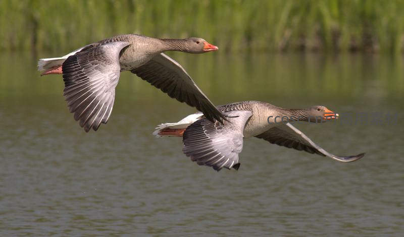 两只灰雁展开宽大的翅膀,在平静的湖面上低空飞行,水波微漾,背景是模糊的绿色芦苇,展现出和谐的自然生态画面。
