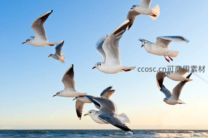 一群海鸥在蔚蓝的天空与浩瀚的大海之间自由翱翔,它们舒展翅膀,姿态各异,构成一幅充满动感与生命力的海滨风景画卷。