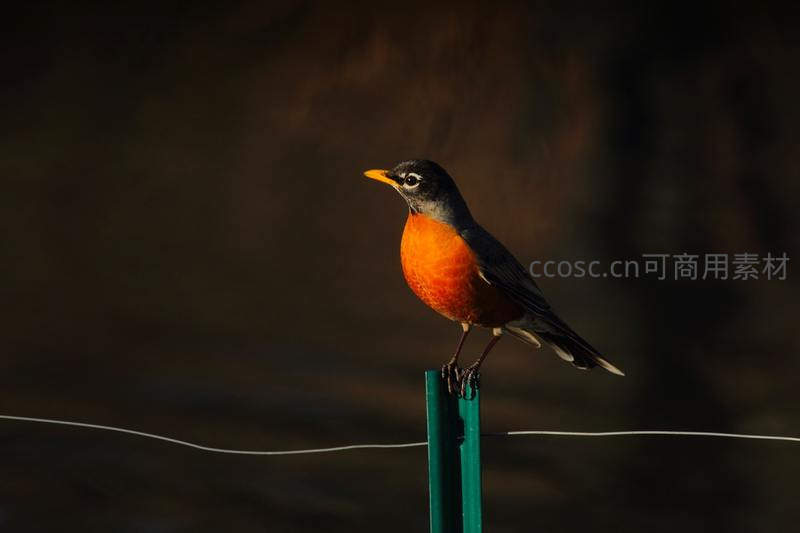 知更鸟伫立在绿色金属杆上,橙红色胸脯被侧逆光照亮,黑色羽翼与背景深邃暗影形成强烈对比,散发宁静而温暖的气息。