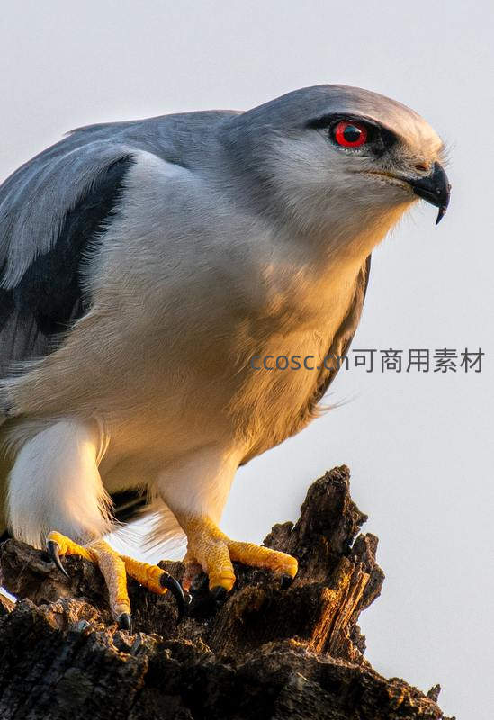 一只灰鹰立于枯木之上,红色眼眸炯炯有神,锋利的黄色爪子紧扣树干,展现出捕食者的威严与专注。