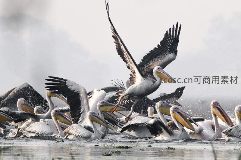 一群鹈鹕在水面激烈争食,中央一只展翅欲飞,溅起水花四散,展现野性活力与群体协作的壮观场面。