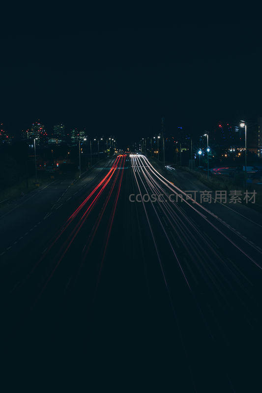 深夜高速公路上,车辆尾灯拉出长长的红色光轨,与路旁路灯交织成流动的画卷,展现现代都市不息的脉搏。