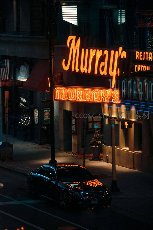 一家名为Murray's的餐厅在夜晚被橙色霓虹灯点亮,门前停着一辆黑色轿车,整个场景散发着美式复古风情与都市夜生活的魅力。