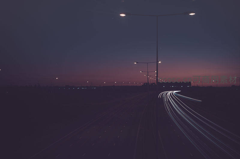 黄昏时分的高速公路,车灯轨迹如丝带般划过路面,在长曝光下形成流动的光影,展现现代交通的动感与科技感。