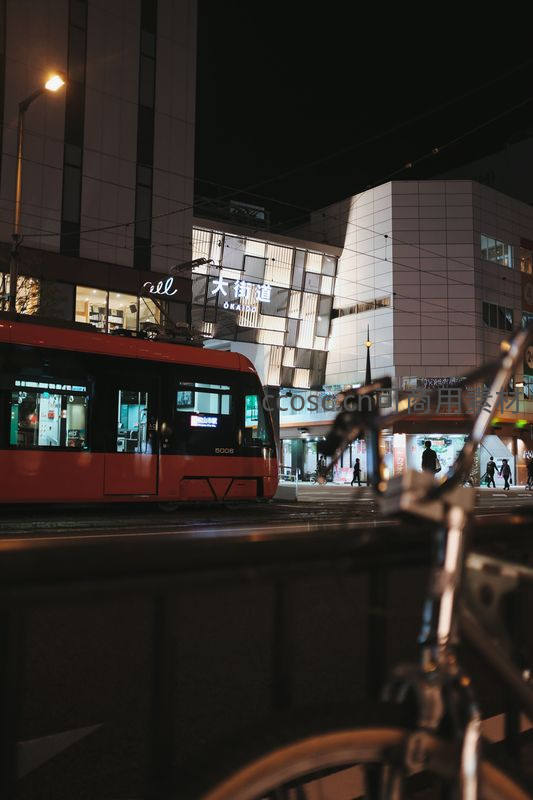 一辆红色电车在现代建筑群中缓缓驶过,前景模糊的自行车框出画面,远处“大街道”招牌亮起,营造出宁静而富有层次的城市夜景。