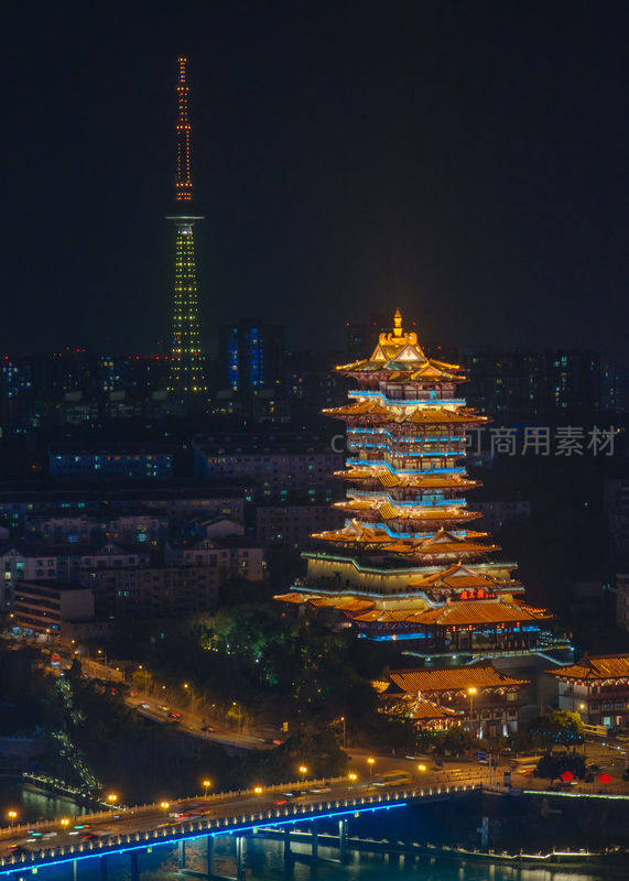 灯火辉煌的古塔矗立于现代城市中心,与远处高塔和万家灯火共同构成一幅古今交融的壮丽夜景画卷。