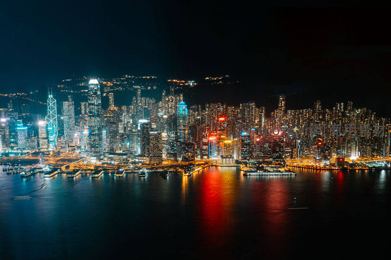 维多利亚港两岸摩天大楼灯火辉煌,五彩斑斓的霓虹倒映在平静的水面上,形成绚丽的光影长廊,彰显国际大都市的无限魅力。
