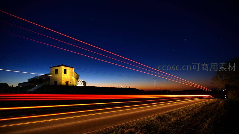 乡村小路旁的孤屋在深蓝夜空下静默,车辆驶过留下绚烂光轨,动静结合,营造出梦幻而宁静的氛围。