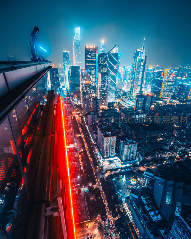 从高空俯瞰,整座城市被璀璨的灯光点亮,一条鲜红的光带如血管般贯穿其中,四周林立的摩天大楼灯火通明,展现出无与伦比的现代都市繁华景象。