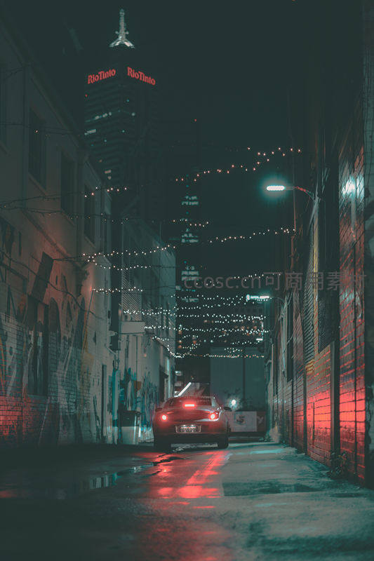 霓虹小巷夜色,车影与涂鸦的都市诗篇